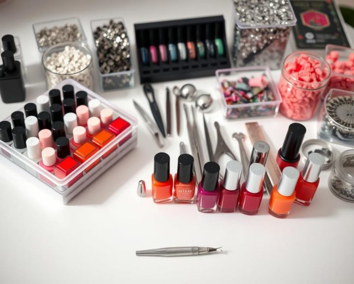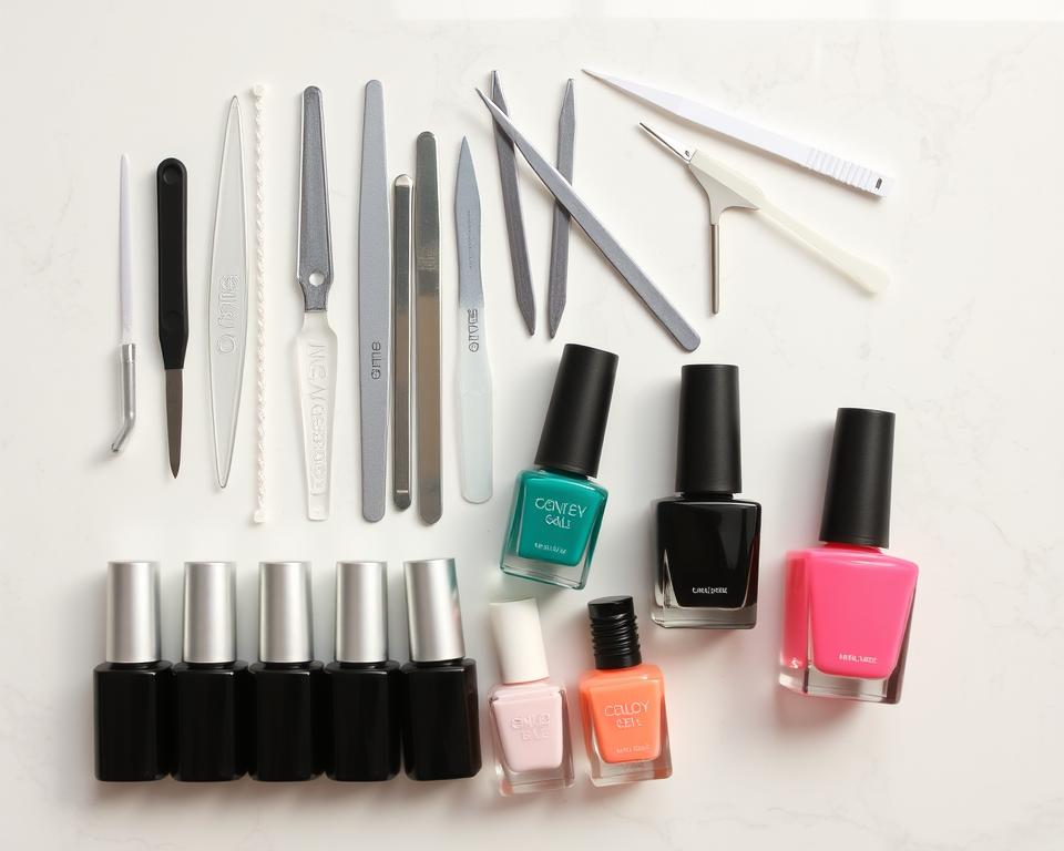 Having the right tools and products is key for perfect nails. A good kit has many nail care implements. These help create stunning nail designs.